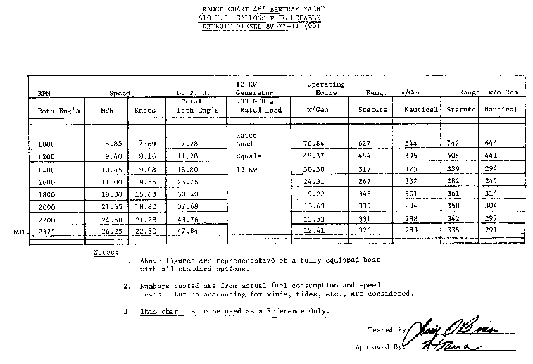 The '81 had a half tower, chair and more equipment, and the speeds were roughly 1 knot less across the board under similar conditions. Most likely, my memory of the 46C being an 18-20 knotter was based on full tower boats with all that extra drag. We didn't have much wind in the tower to slow it down that much, but rest assured that it does. In any case, that's not too far off, and I found in the tattered old Bertram manual the speed and fuel table as supplied by Bertram for the"Bertram Yacht" which I take to mean the MY and not the convertible. Bear in mind that the MY is a heavier boat. It is reproduced below.